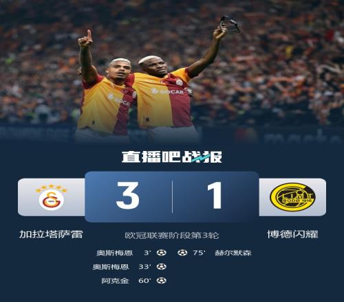 本轮欧冠加拉塔萨雷主场3-1击败博德闪耀,奥斯梅恩双响,阿克金破门。