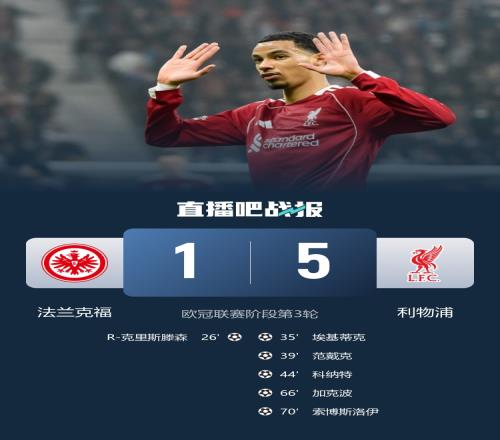 利物浦在欧冠5-1大胜法兰克福,维尔茨两助攻!埃基蒂克、范戴克、科纳特、加克波和索博都取得进球。