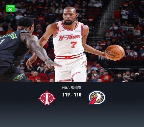 第四节火箭小贾巴里-史密斯拿下10分,鹈鹕普尔拿下11分,最终火箭119-110战胜鹈鹕